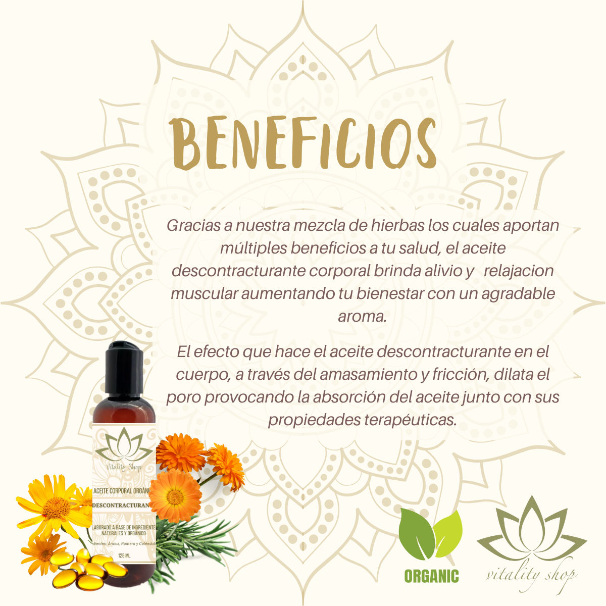 Gracias a nuestra mezcla de hierbas los cuales aportan múltiples beneficios a tu salud, el aceite descontracturante corporal brinda alivio y relajación muscular aumentando tu bienestar con un agradable aroma.