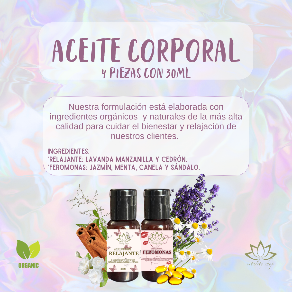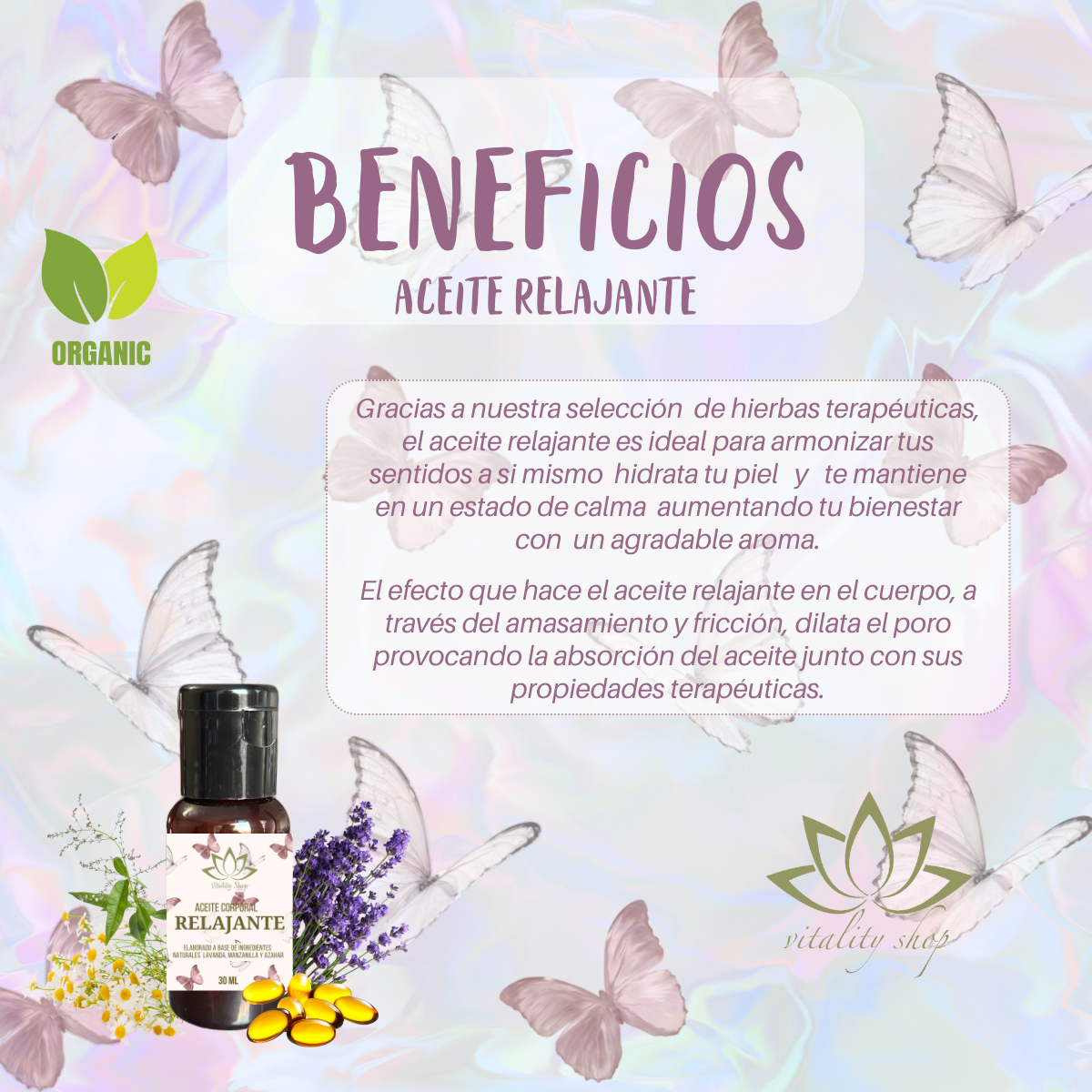 Gracias a nuestra selección de hierbas terapéuticas, el aceite relajante es ideal para armonizar tus sentidos, hidrata tu piel y te mantiene en un estado de calma aumentando tu bienestar con un agradable aroma.