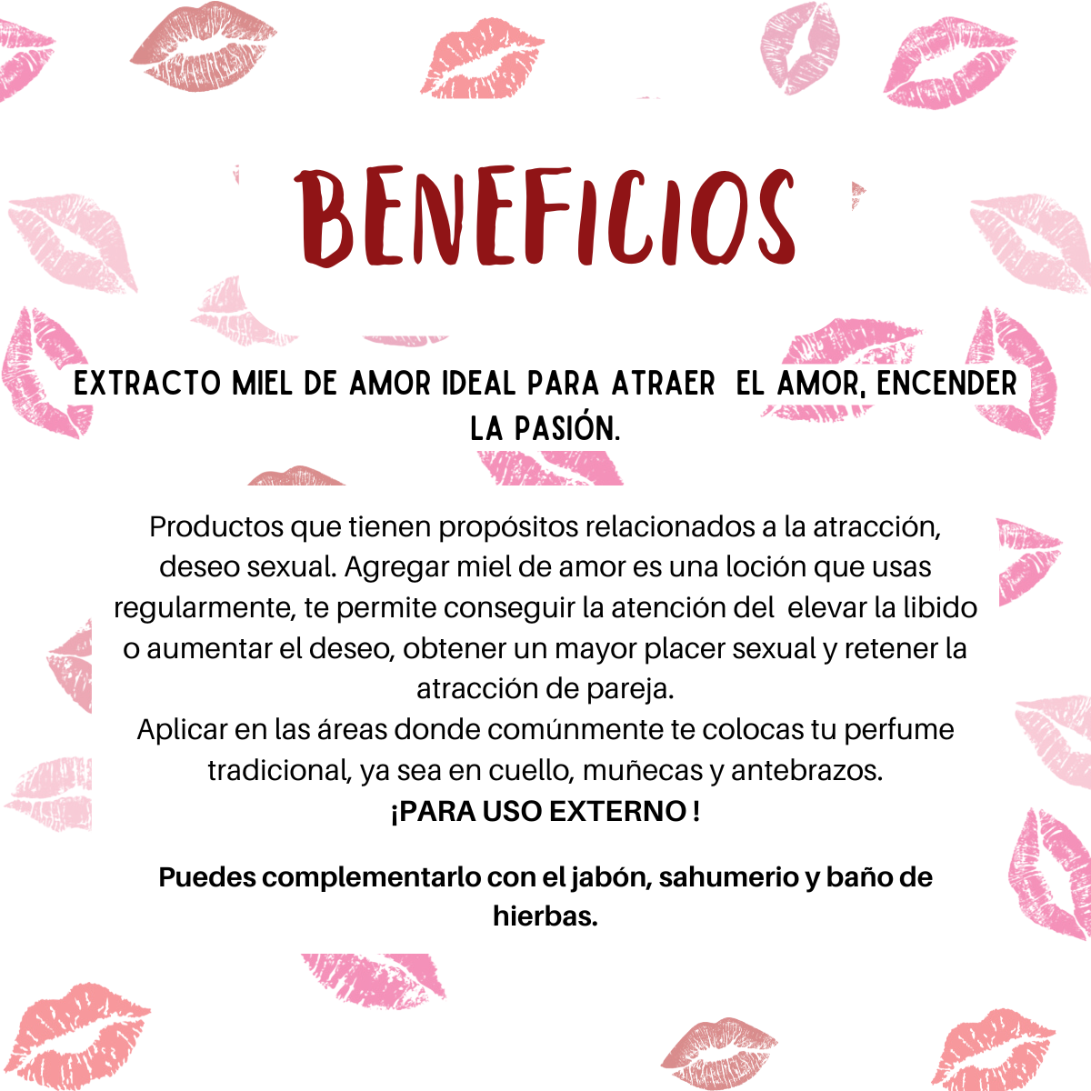 Productos que tienen propósitos relacionados a la atracción, deseo sexual. Agregar miel de amor es una loción que usas regularmente, te permite conseguir la atención del elevar la libido o aumentar el deseo, obtener un mayor placer sexual y retener la atracción de pareja.