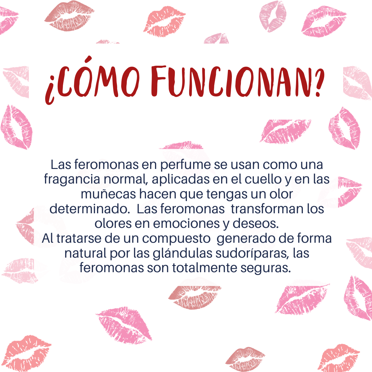 Las feromonas en perfume se usan como una fragancia normal, aplicadas en el cuello y en las muñecas hacen que tengas un olor determinado. Las feromonas transforman los olores en emociones y deseos.