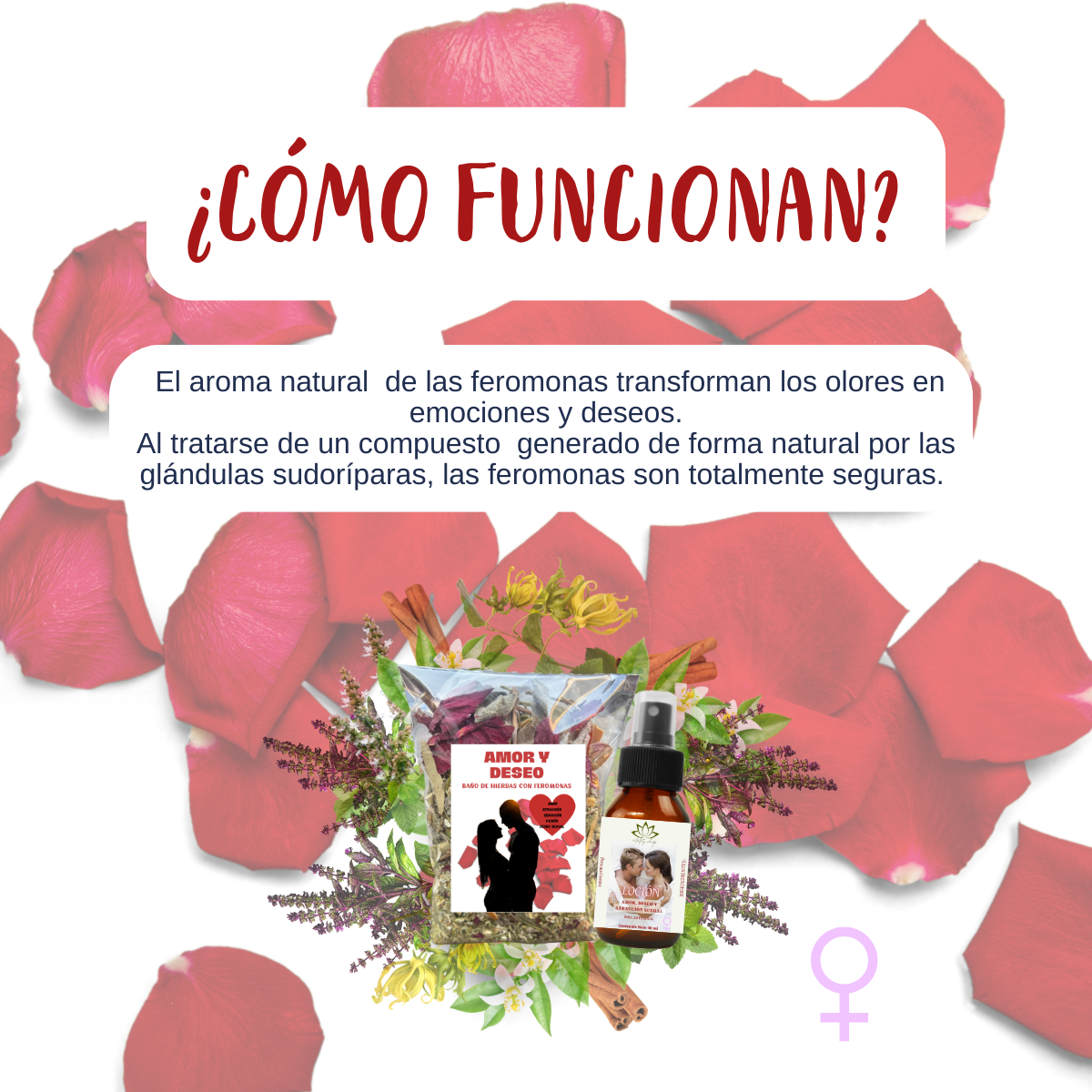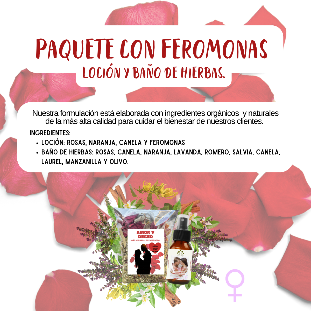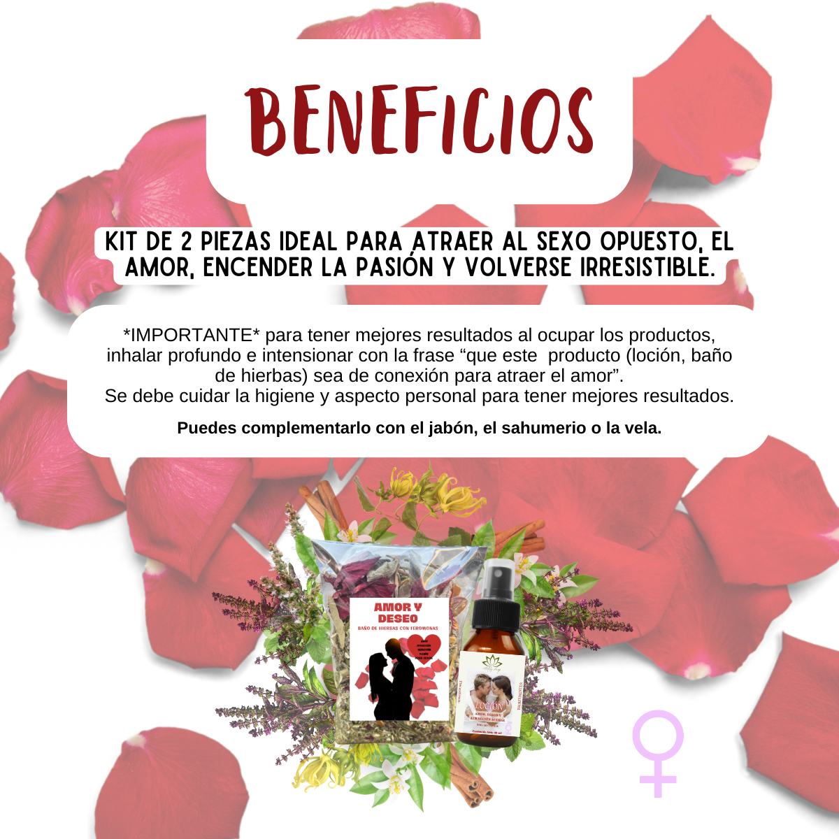 *IMPORTANTE* para tener mejores resultados al ocupar los productos, inhalar profundo e intencionar con la frase “que este producto (loción, baño de hierbas) sea de conexión para atraer el amor”.