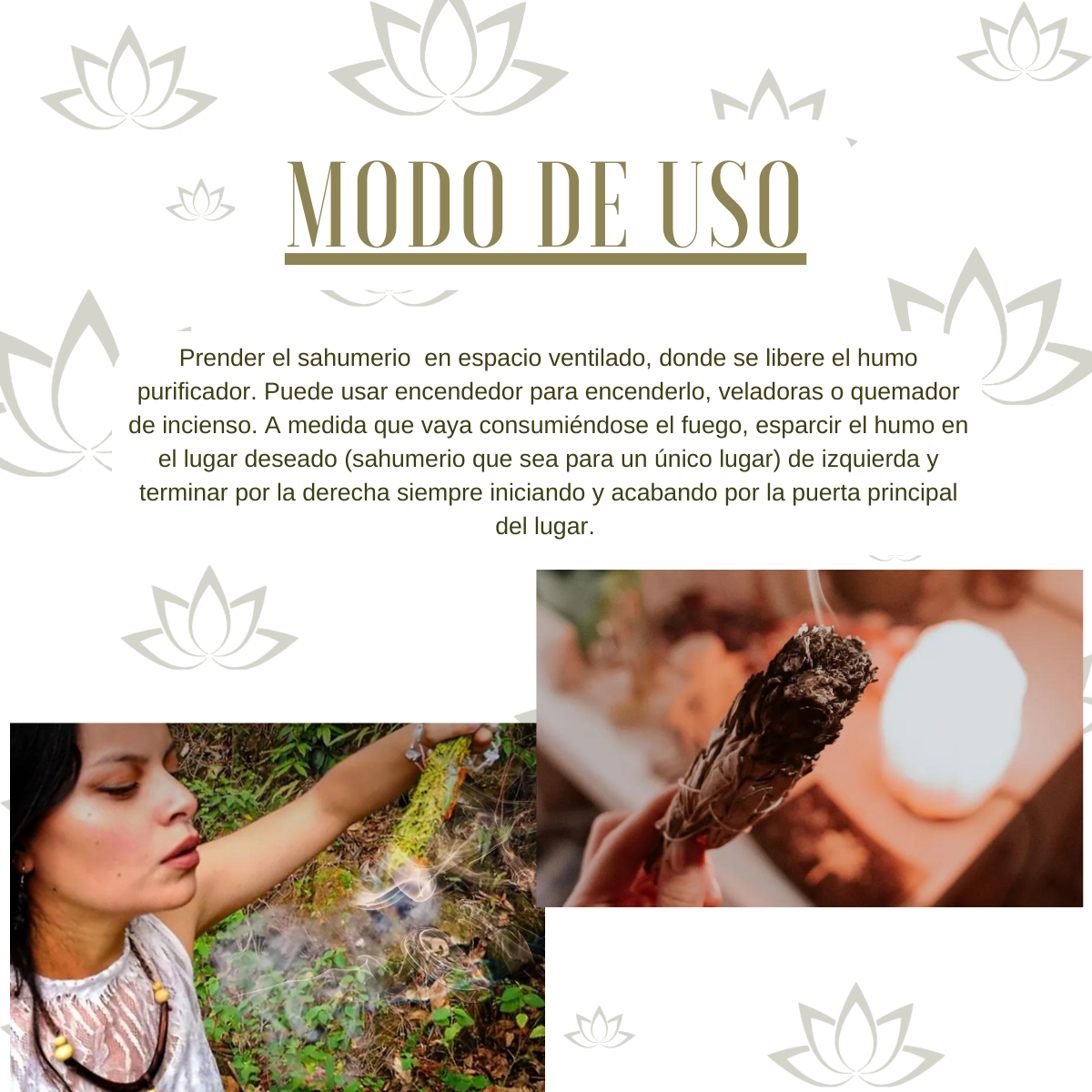 Prender el sahumerio en espacio ventilado, donde se libere el humo purificador. Puede usar encendedor para encenderlo, veladoras o quemador de incienso. A medida que vaya consumiéndose el fuego, esparcir el humo en el lugar deseado (sahumerio que sea para un único lugar) de izquierda y terminar por la derecha siempre iniciando y acabando por la puerta principal del lugar.