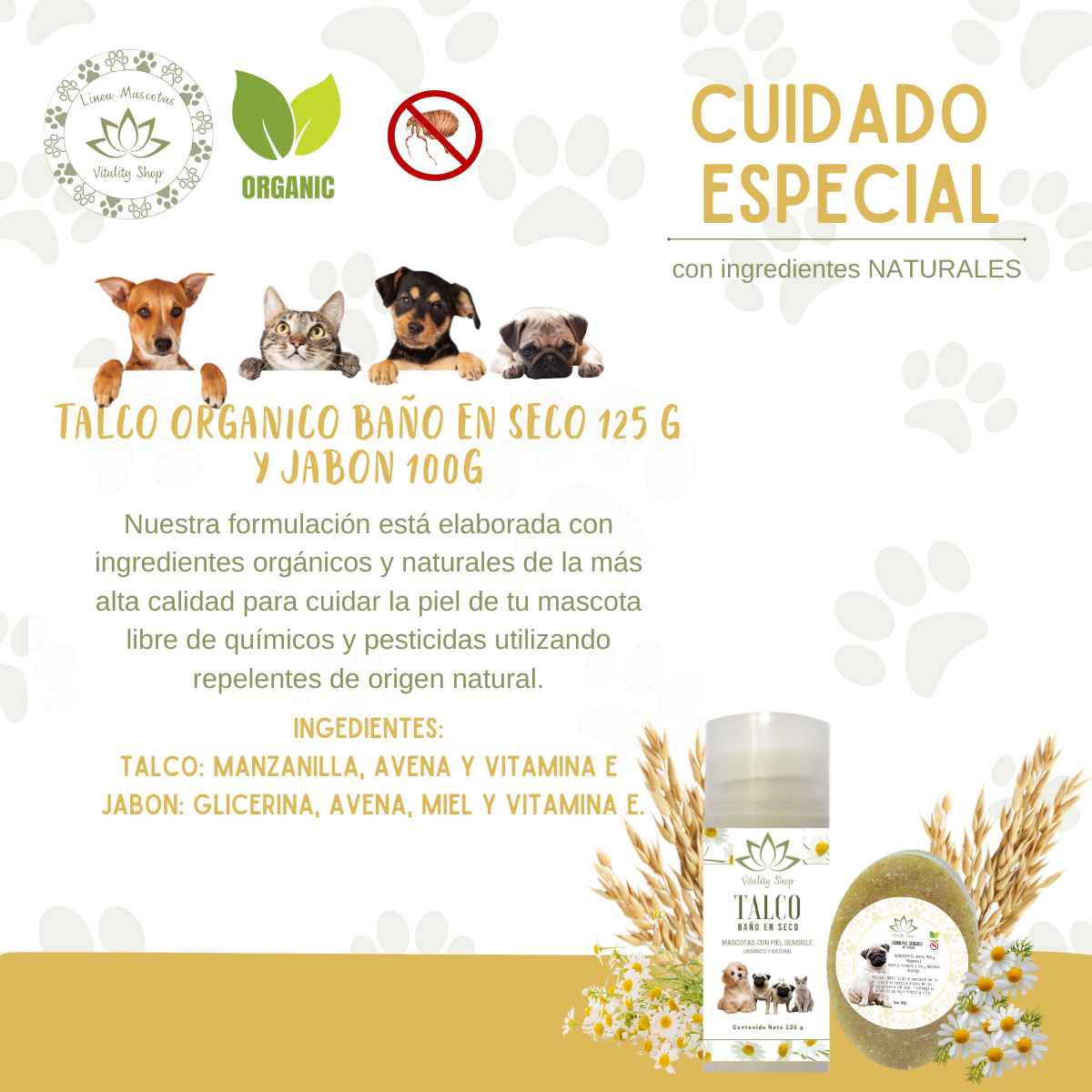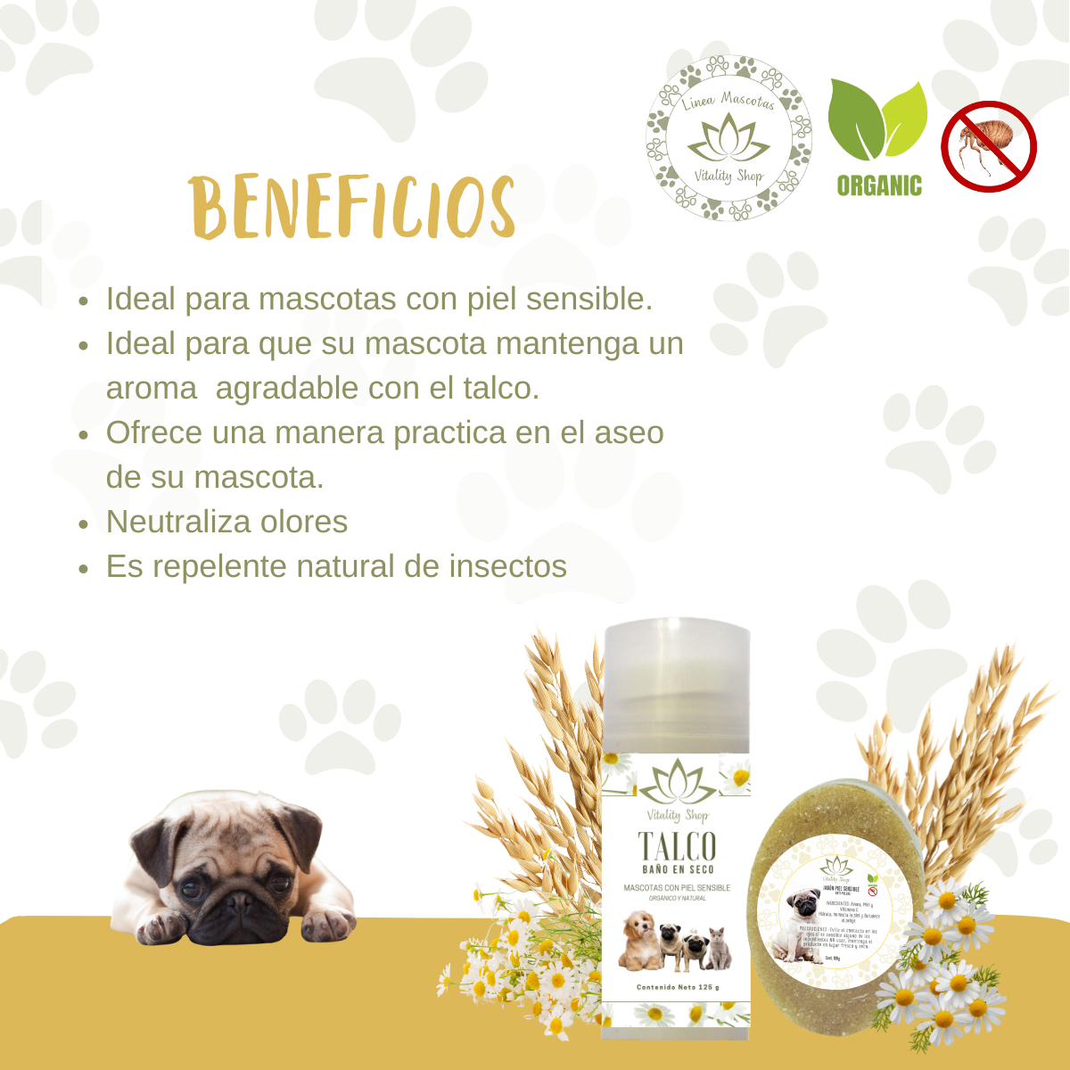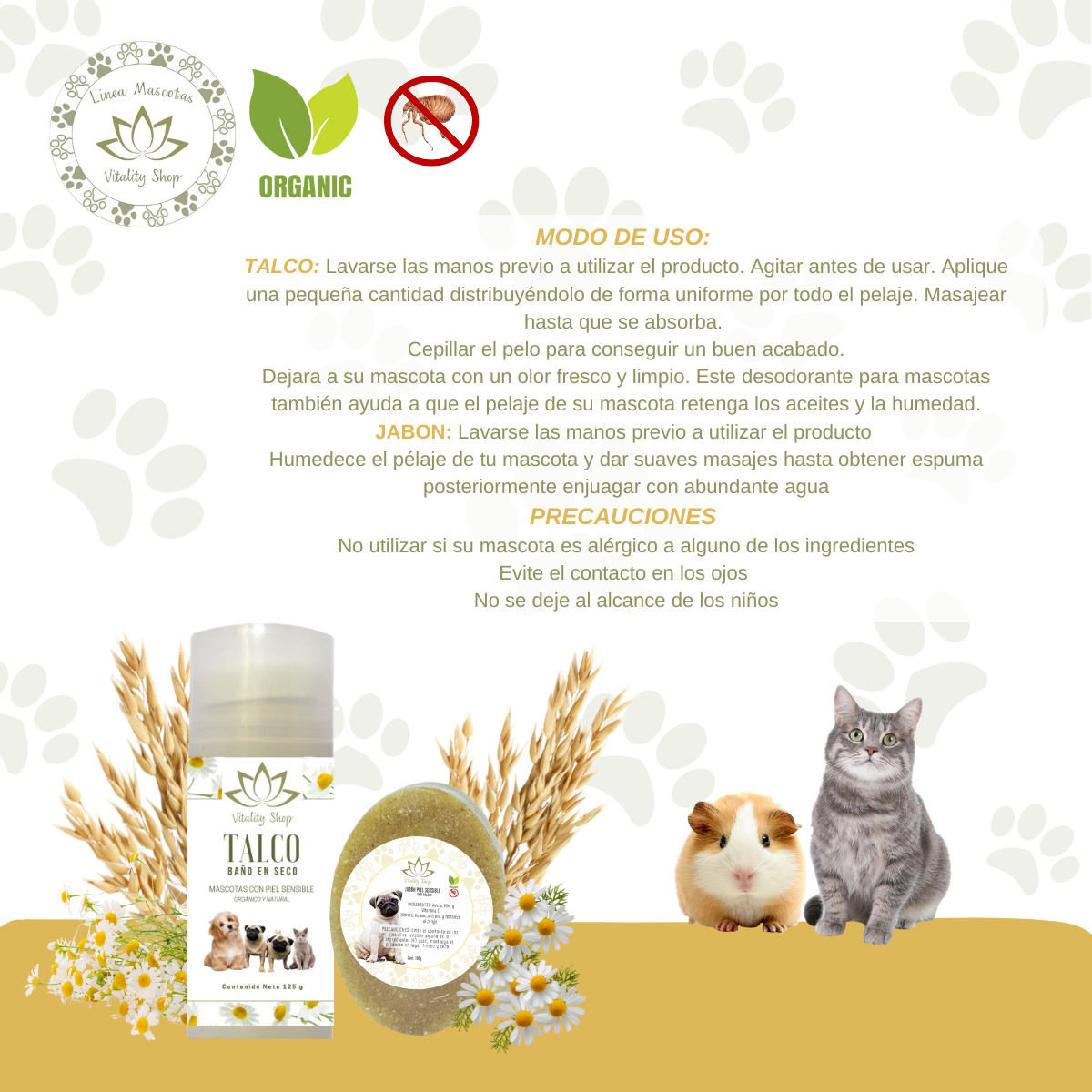 TALCO: Lavarse las manos previo a utilizar el producto. Agitar antes de usar. Aplique una pequeña cantidad distribuyéndolo de forma uniforme por todo el pelaje. Masajear hasta que se absorba.