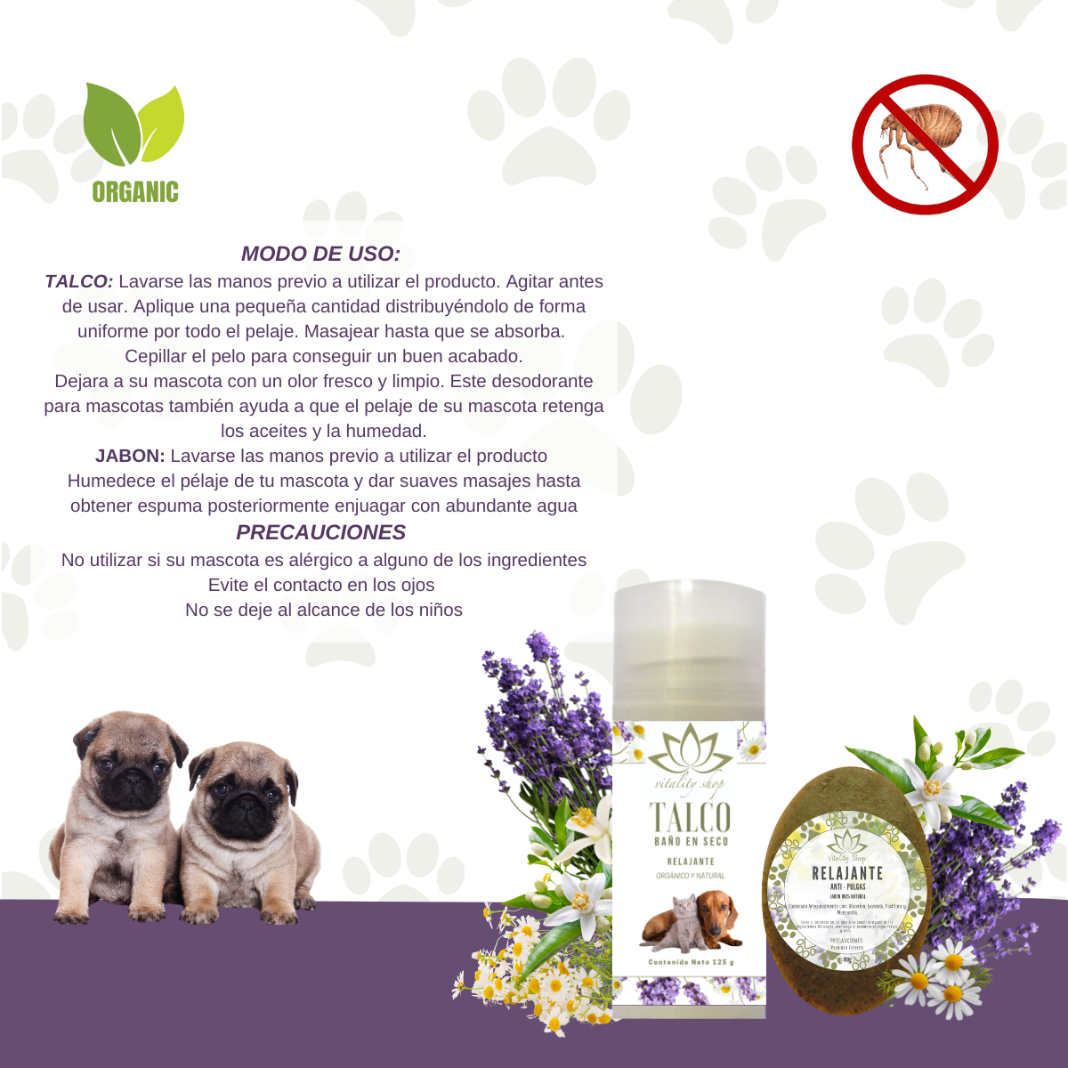 TALCO: Lavarse las manos previo a utilizar el producto. Agitar antes de usar. Aplique una pequeña cantidad distribuyéndolo de forma uniforme por todo el pelaje. Masajear hasta que se absorba.